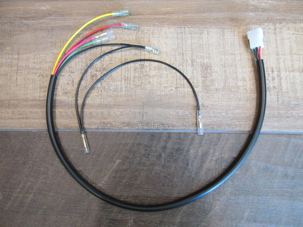 Wiring for universal left handlebar switches (headlight, parking lights, horn, turn signals) Works great with the multitude of universal switches available. Butt connectors and heat shrink are included to splice the sub-harness directly to the wires from the switch. Wire connections should be staggered to yield a smaller overall finished diameter. Larger diameter sheathing is provided to aid routing the spliced wires through the sheathing after all of the connections have been made. Wires to the headlight plug are 800 mm in length. Wire to ground is 1000 mm in length. Wires are intentionally left separate from the 12 terminal plug - so that the wires may be more easily spliced and routed through the sheathing or inside the handlebar.
