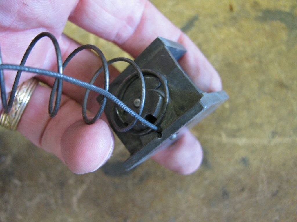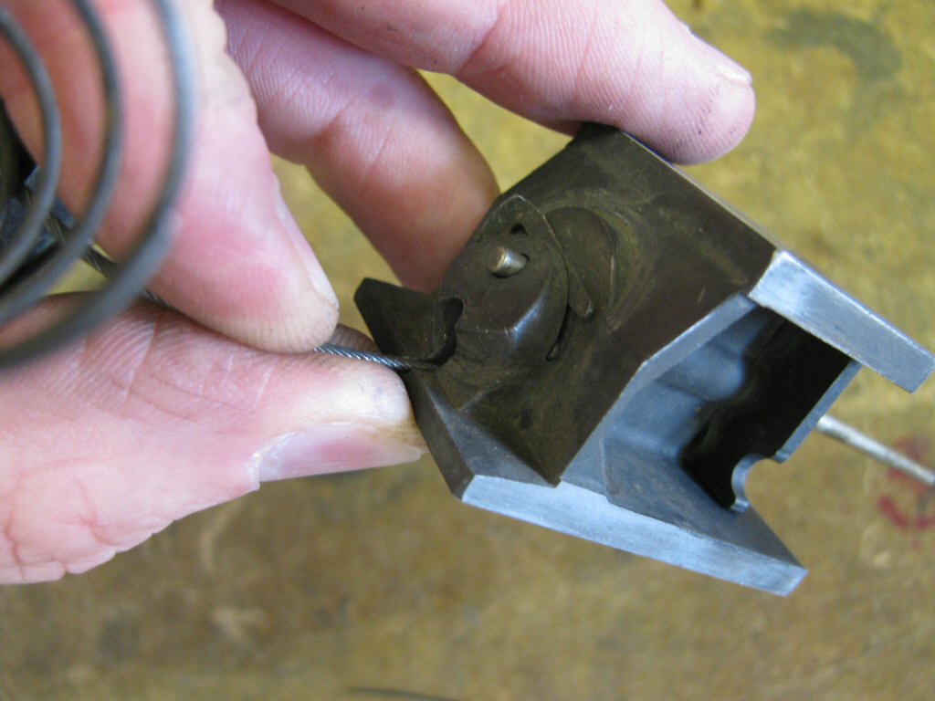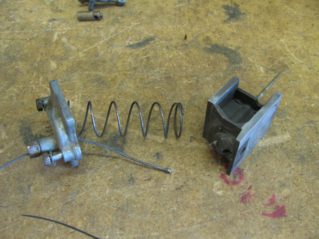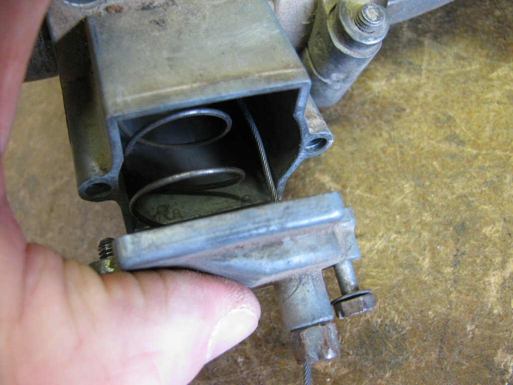 The cable does not go through the spring at all. Instead, simply get the cable situated within the slide, then move the spring over to hold the cable in place. Pay careful attention to the direction the slide is facing in relationship to the body of the carb (large flat side faces the intake manifold) and also that the cable holder on the top cap is nearest the intake manifold.