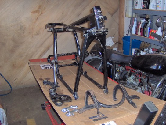 Was planning on going to the Vintage Swapmeet and Show in York, PA with some friends, but didn't feel like risking my life to get there. Snow was falling steadily and the State Police were urging people to stay off the road. Ate a hearty breakfast and went out into the shop instead. Cleaned up the previously mentioned handlebar risers with chrome polish and a few other pieces with mineral spirits. Puttered around with miscellany like the ignition switch and making a list of things I needed (ignition keys, steering head and swing arm bearings, swing arm seals). Dug out some more bits that matched (swing arm pivots, locking nuts and cover nuts, shock mount studs).