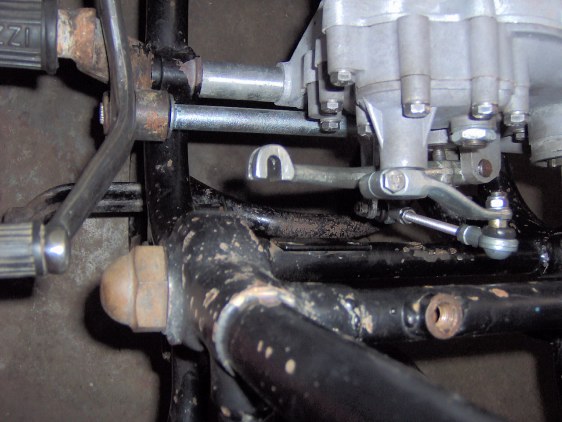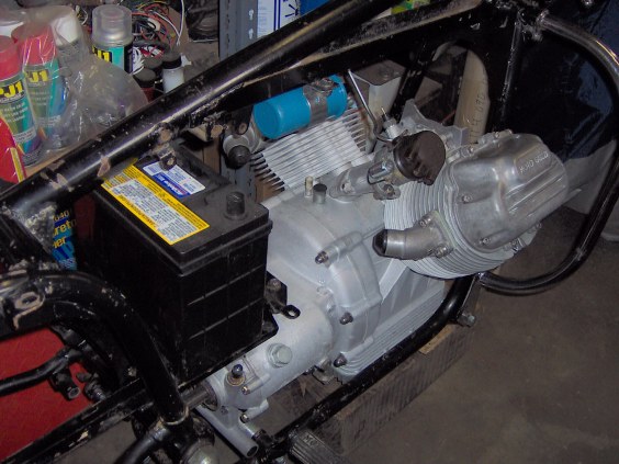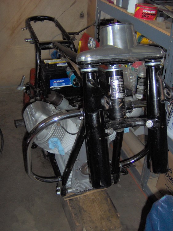 Installed the shift linkage with ball end joints and shift pedal, test mounted the battery tray and battery. Later chose a pair of fork shrouds that matched pretty well, cleaned and waxed them. Test fitted them, the fork top plate and instrument housing. Mounted the coil and starting sorting hardware to make a list for any I still needed.