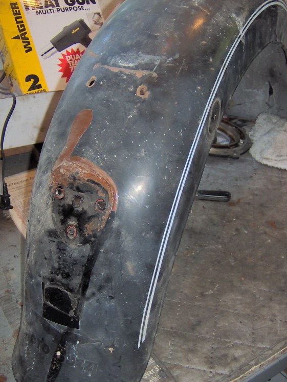 Met this morning with Dan Friend to swap rear fenders with him. He had kept the rear fender (as a spare for his Eldo) when he sold me the parts that form the basis of this project. The one I had intended to use had a few dents that couldn't be removed without damaging the original paint and I remembered the one Dan had was straighter. So, I swapped him a good fender in lovely spray bomb black I had bought for the 75 ex-LAPD Eldo project for his straight one in original paint. Initially it looked a bit rough - someone had spilled what looked like thick red primer down the back of it and the paint was pretty chalky. In the photo below you can see the worst part of it remains around where the taillight mounts and where I'd already removed the rest. Luckily it came off easily once a bit of heat was applied to the underside of the fender.