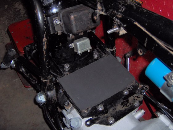 Glued the little rubber strips onto the bottom of the regulator bracket, then attached it too. Cut a mouse-pad for use as a battery cushion and laid that in place. Have to get up early again, so quit early and went in to eat, read my emails and then get some shut-eye.