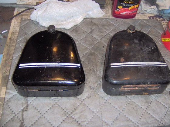 Decided to work on installing the toolboxes, since I couldn't access the lathe to do the brakes yet. After a thorough cleaning with S100 (Note: don't leave it on too long or it'll dissolve the original pinstripes! Yikes!), I used Meguir's paint cleaner and then polish to bring back the gloss. A heavy coat of Mother's California Gold wax and they were ready to install.