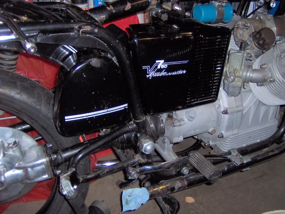 Getting the bolt holes to all line up was a bit tricky, but eventually the toolboxes were on. Decided to clean up a battery cover too, so I could see how they'd look together. Same procedure - turned out nice and both match the front fender and fuel tank (both from another bike) pretty well.