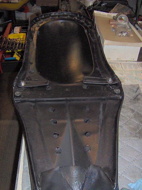 Spent the last several days recovering the seat. Probably could have finished it in one day if I'd had enough clamps to hold the cover in place while the glue dried. The old cover was just too cracked and stiff for comfort, so the new cover was really a necessity. Removed the old cover and found the foam to be in excellent condition - it appears that a thin layer of new foam had already been applied over the old. While the cover was off, I wire brushed the the base and sprayed it with Dupli-Color Truck Bed Liner.