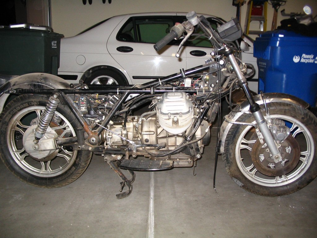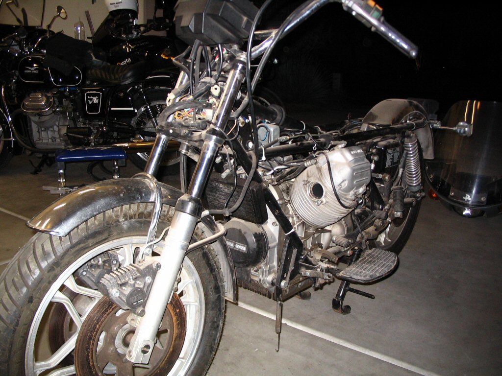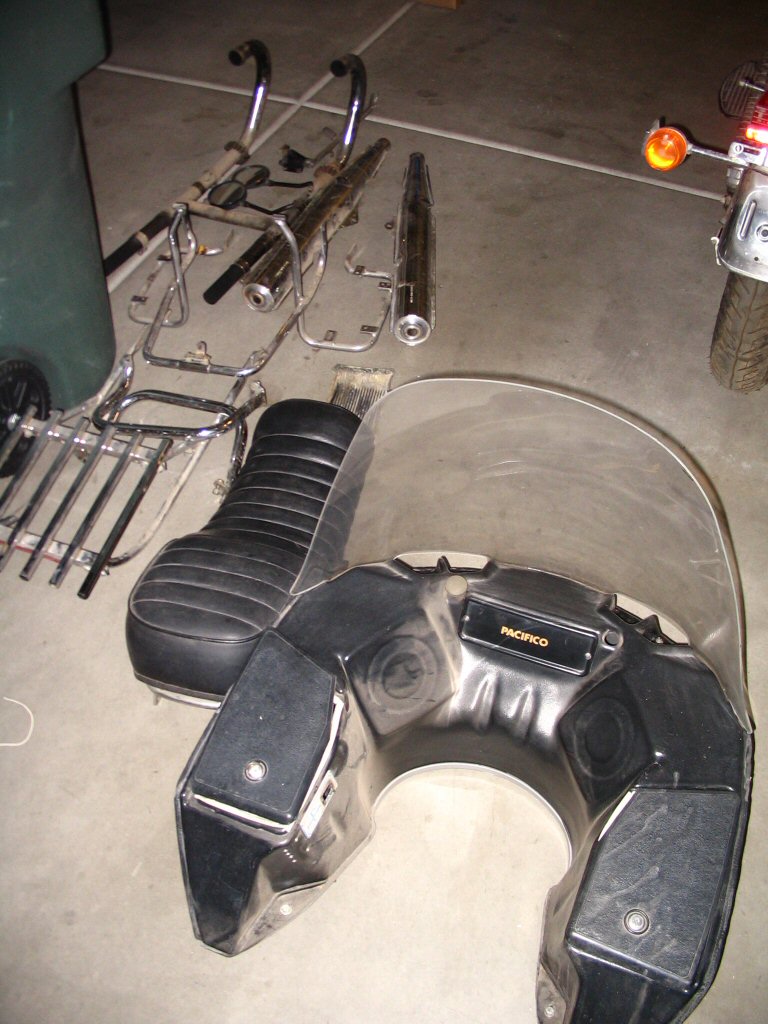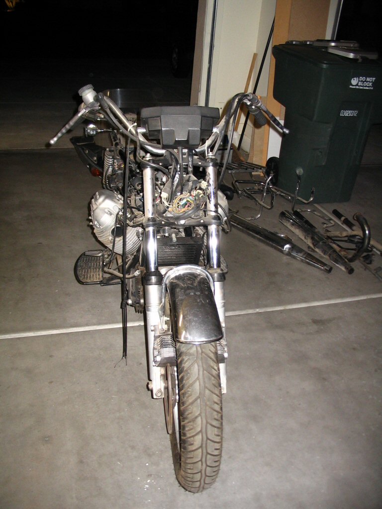 The previous owner delivered the convert to me this afternoon. We did the deal, took a couple photos, and then I proceeded to begin disassembly. Overall, I am quite pleased with how well things came apart. There were no rusty, crusty, stuck bits and even the exhaust slid apart like a dream. Good stuff. I think the bike has sat outside for the last couple months here in Phoenix. But, it most certainly did not spend the last 11 years outside. It is in too good of condition for that to have been the case.